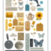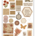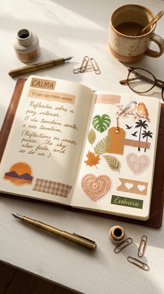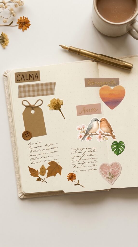 Kit de adesivos digitais com estética vintage e natural, perfeito para scrapbook, journaling, planners e colagens criativas. Inclui elementos como folhas, flores secas, etiquetas, corações, botões, pássaros e frases inspiradoras como “Calma”, “Amor”, “Essência” e “Horizonte”.