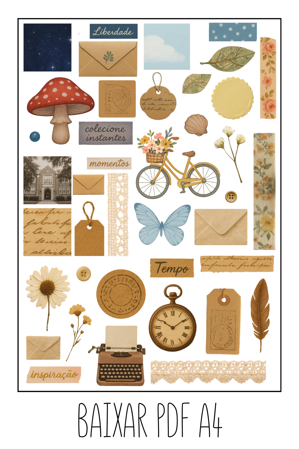 Baixe gratuitamente esta folha de adesivos vintage para imprimir em tamanho A4. O arquivo inclui diversos elementos delicados e nostálgicos, como envelopes, flores, cogumelo, borboleta, bicicleta, relógio antigo, etiquetas, fitas decorativas e outros detalhes inspirados no estilo vintage.